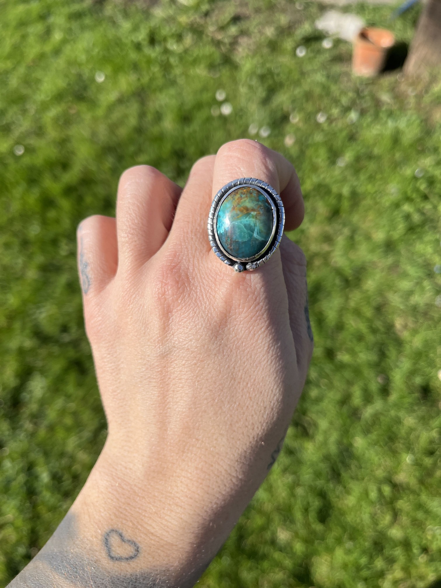 Inicio / Catálogo / Anillos Ajustables en Plata / Anillo de Crisocola peruana