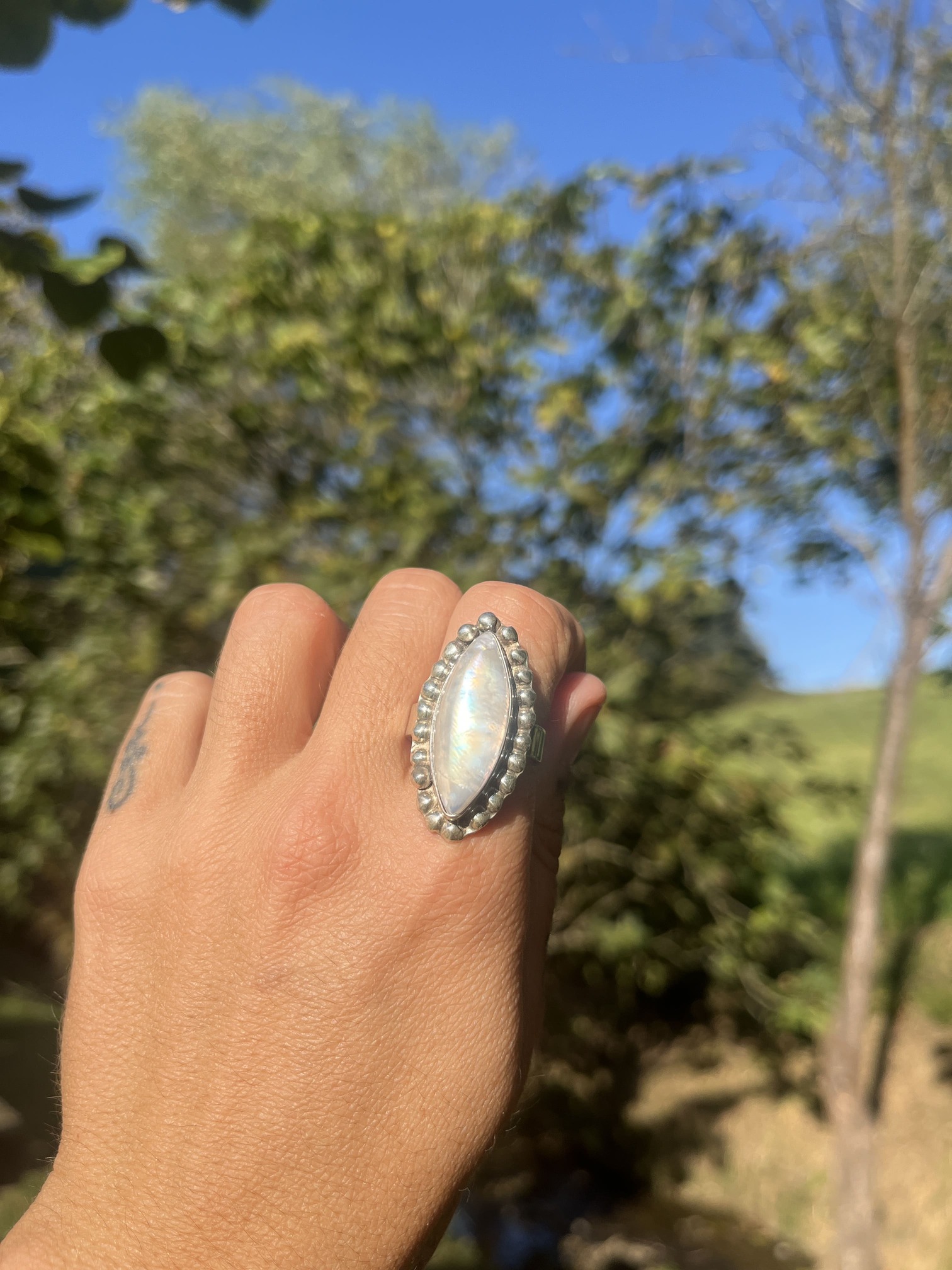 Inicio / Catálogo / Anillos Ajustables en Plata / Anillo de Piedra de luna con dos puntas con bolitas