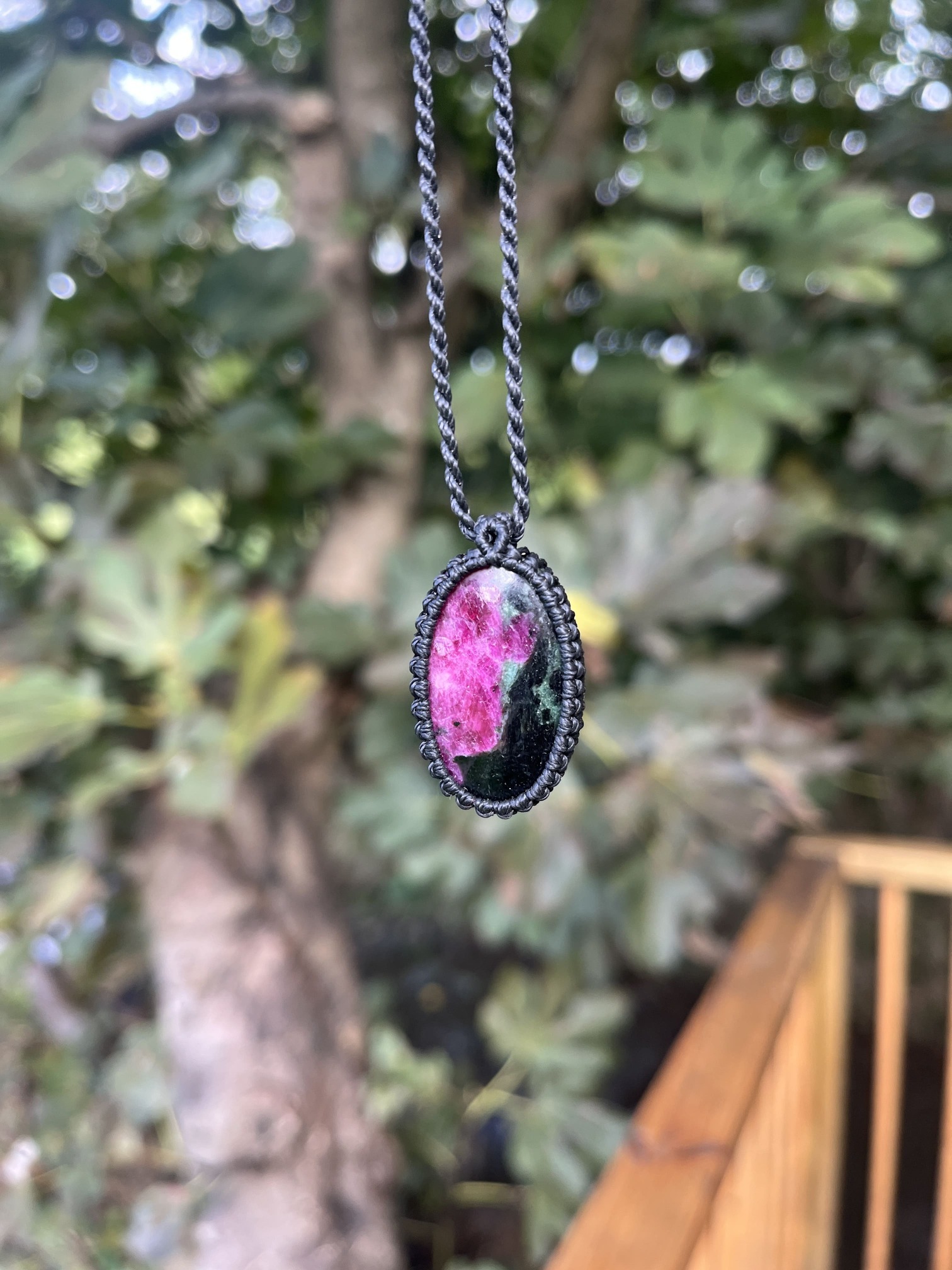 Inicio / Catálogo / Catálogo / Colgante de Macramé de Rubí zoisita